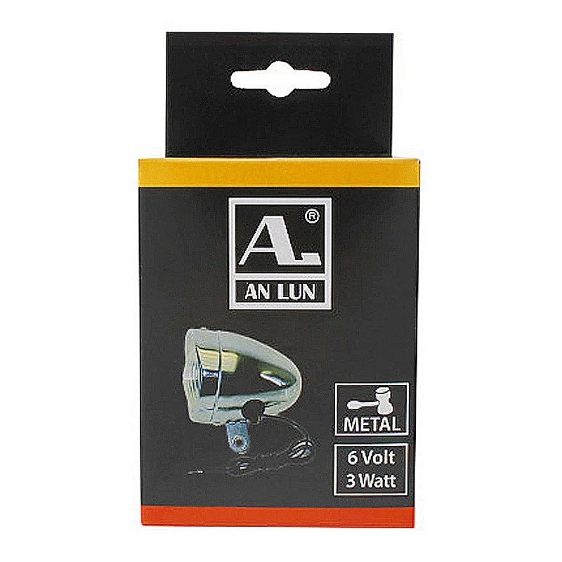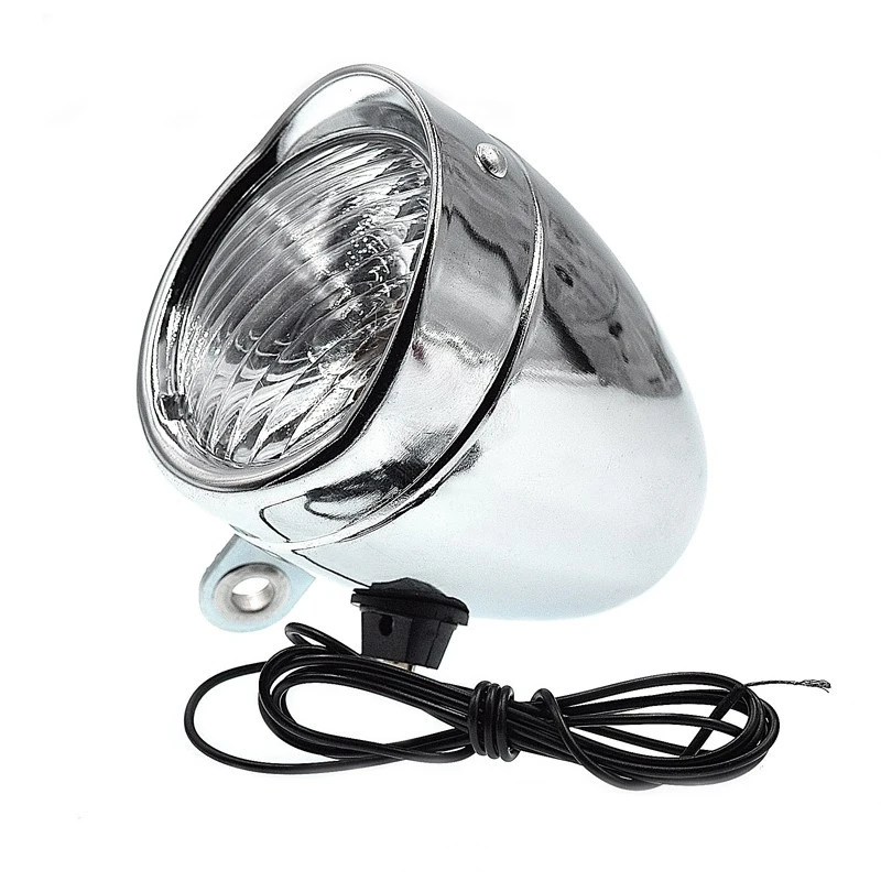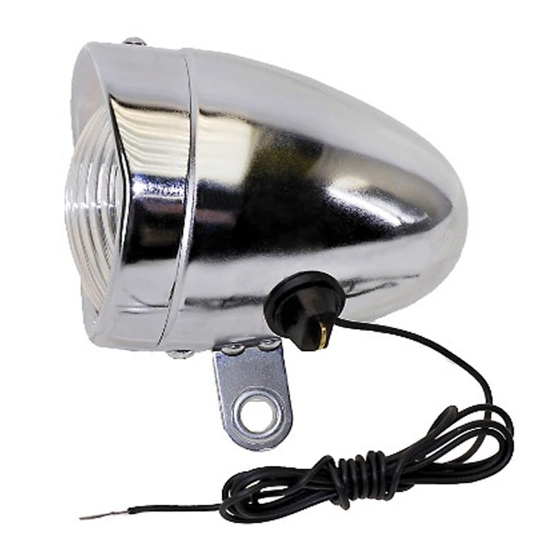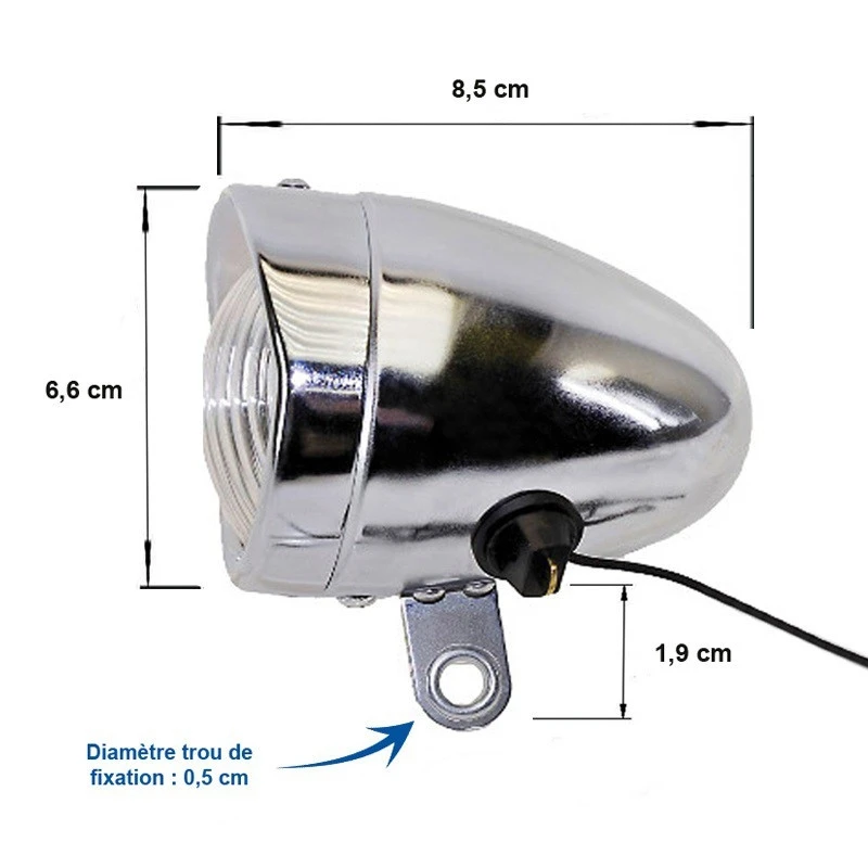 Ce phare avant chromĂ© dispose d’un Ă©clairage blanc puissant. Ce modèle de feu vintage permet au cycliste de personnaliser leur vĂ©lo facilement par un montage sur dynamo 6V/2.4 W. Fourni avec des câbles Ă©lectriques pour le raccordement.