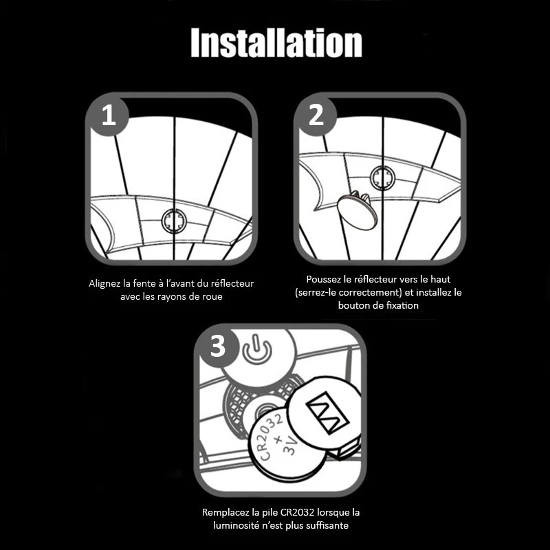L’installation ne prend que quelques minutes, seul ou avec plusieurs éléments réfléchissants dans vos roues de vélo, l’impact visuel attire facilement l’oeil des autres usagers de la route.