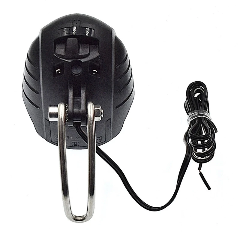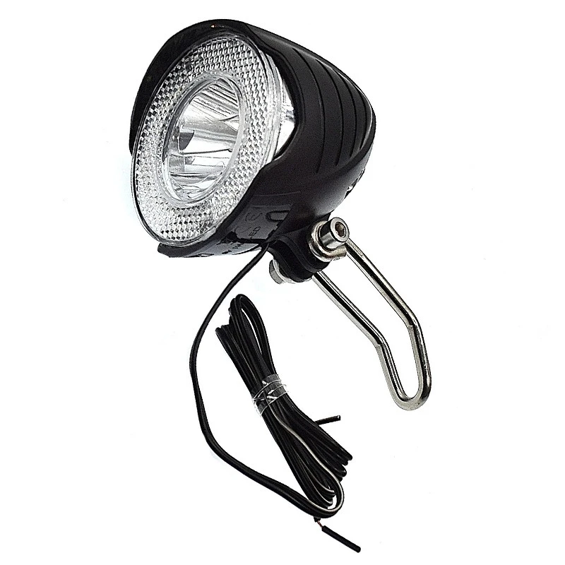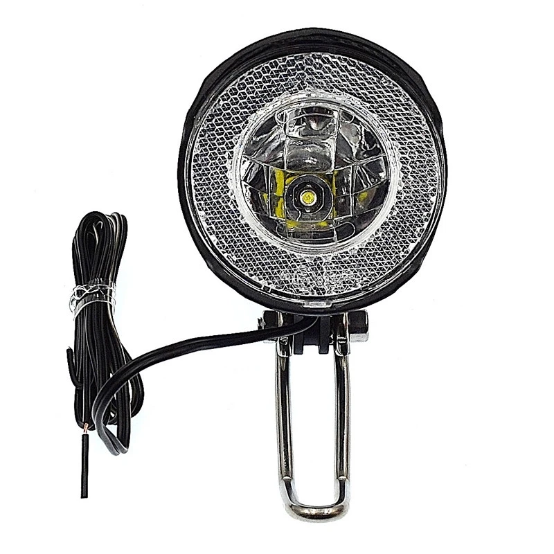Il se fixe sur la fourche avant de votre vĂ©lo Ă l’aide de patte en acier chromĂ© et se connecte Ă la dynamo avec les 2 fils + et -.