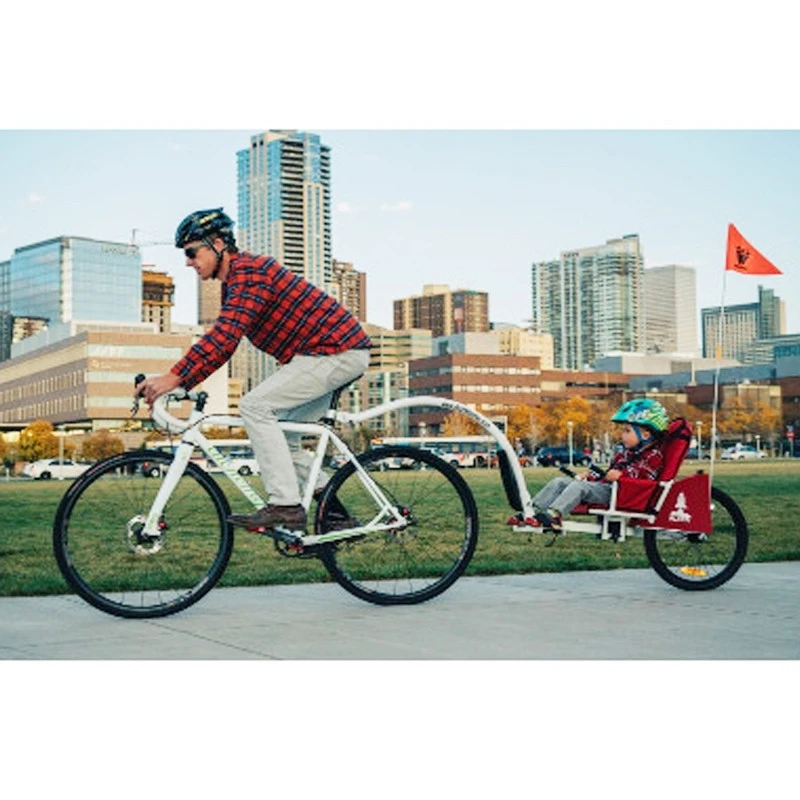 Ce concept de remorque Ă pĂ©dale pour jeunes enfants rĂ©duit l’encombrement sur la route puisqu’elle suit parfaitement la trajectoire du vĂ©lo tracteur.