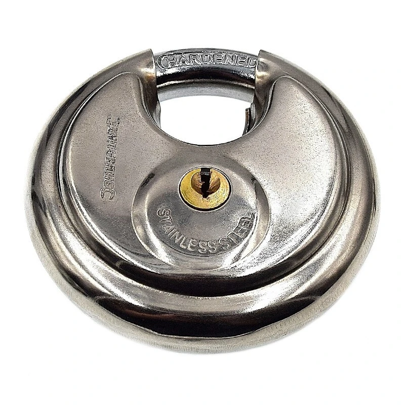 Cadenas de forme circulaire très robuste en acier inoxydable avec résistance maximale à la corrosion. Anse rotative en acier durci et à double verrouillage garantissant davantage de résistance aux attaques, y compris au sciage et à la découpe.